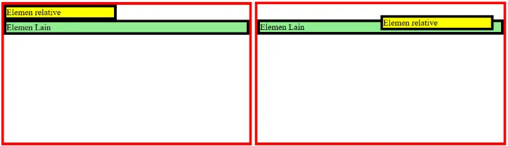 Gambar di sebelah kiri menunjukkan kondisi sebelum position: relative diterapkan. Setelah properti tersebut ditambahkan, elemen relative berpindah secara visual, tetapi tetap mempertahankan ruang aslinya di dalam layout, posisi elemen lain tidak terpengaruh.