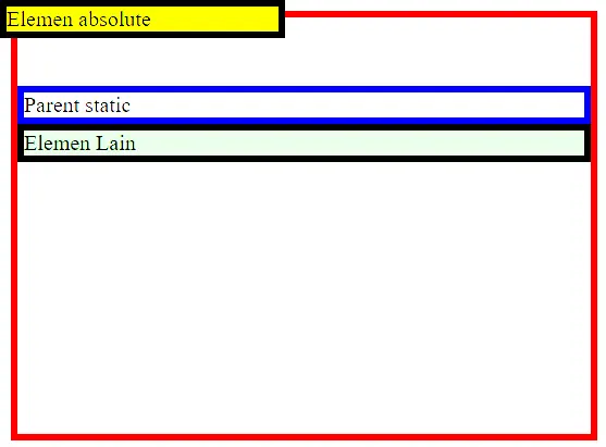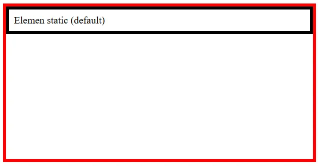 position: static sepenuhnya masih berada di normal flow. Elemen tampil apa adanya dan mengikuti urutan penulisan HTML. Nilai static merupakan nilai default dari properti position pada semua elemen HTML.