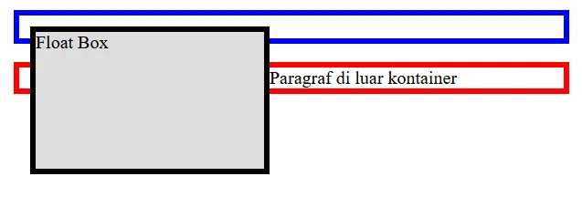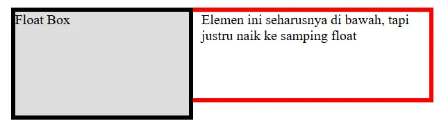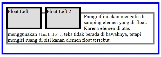 Selain itu, beberapa elemen float yang ditempatkan berurutan akan berjejer secara horizontal selama masih tersedia ruang dalam satu baris. Jika ruang tidak mencukupi, elemen berikutnya akan turun ke baris berikutnya, menyerupai perilaku wrapping, meskipun mekanismenya berbeda dengan Flexbox atau Grid.