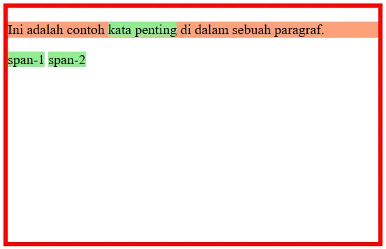 Elemen <span> adalah elemen inline, yang berarti elemen ini mengalir sebaris mengikuti teks dan tidak membuat baris baru, cocok untuk menandai atau memodifikasi bagian kecil dari teks. Inilah fungsi utama elemen inline.